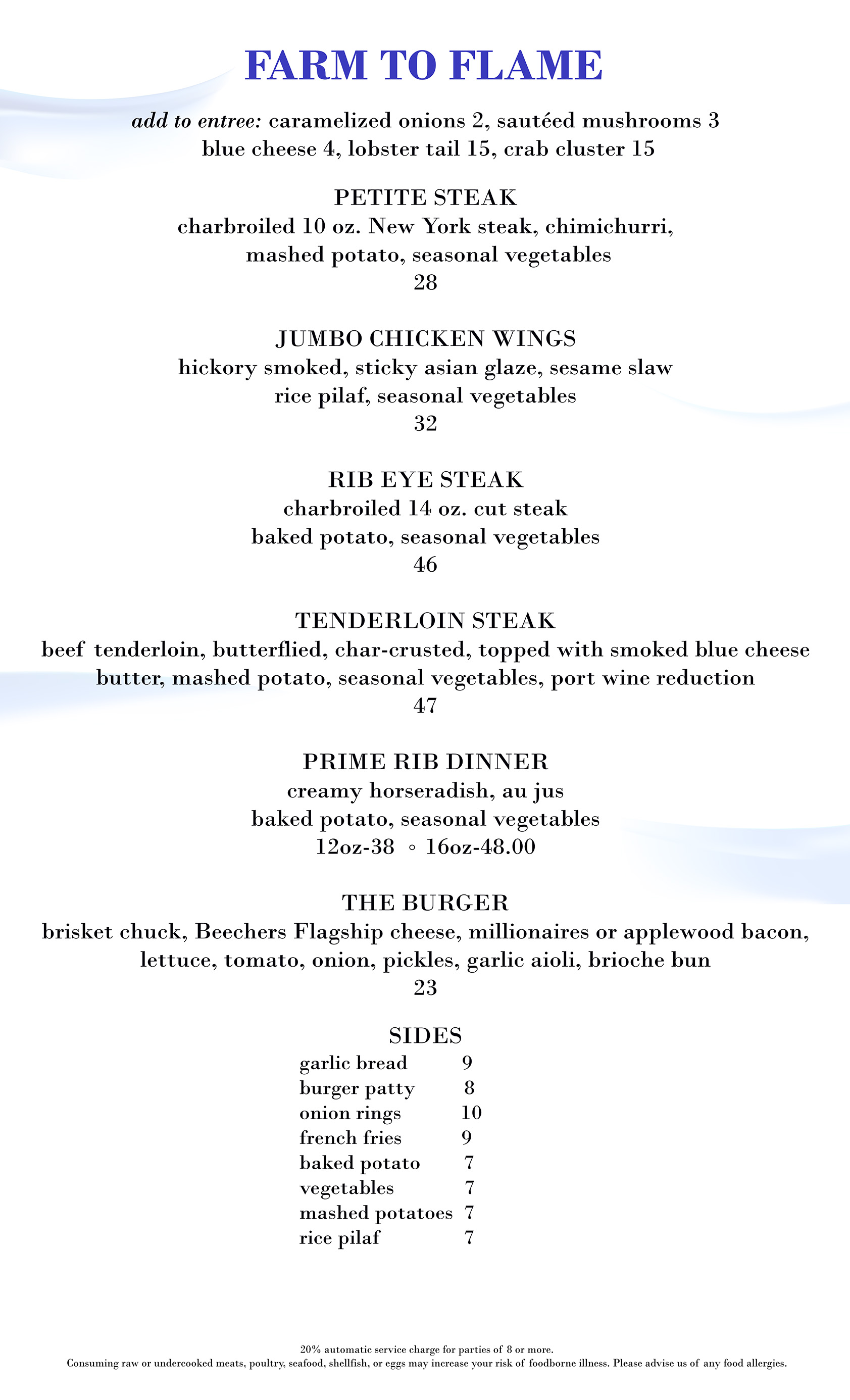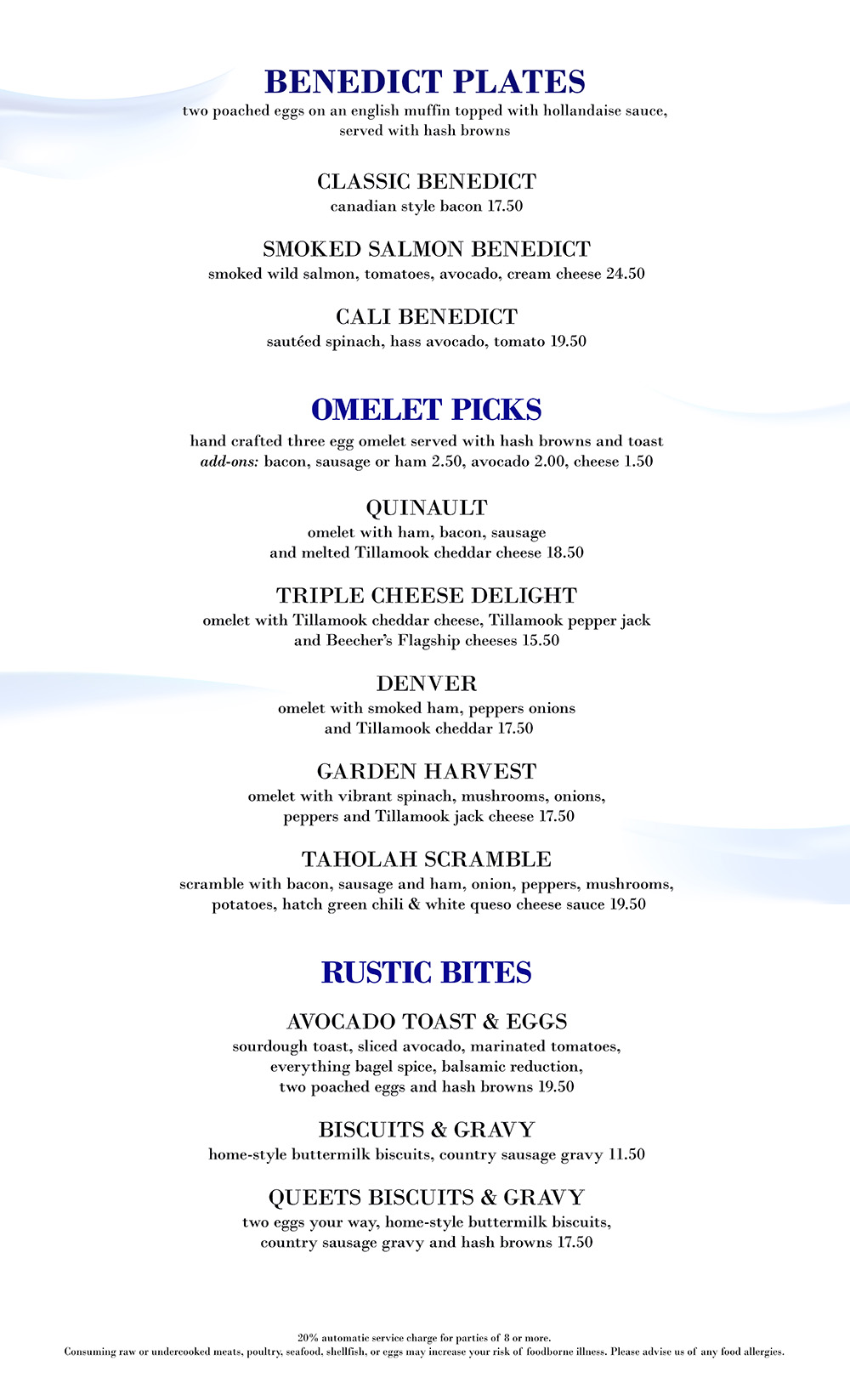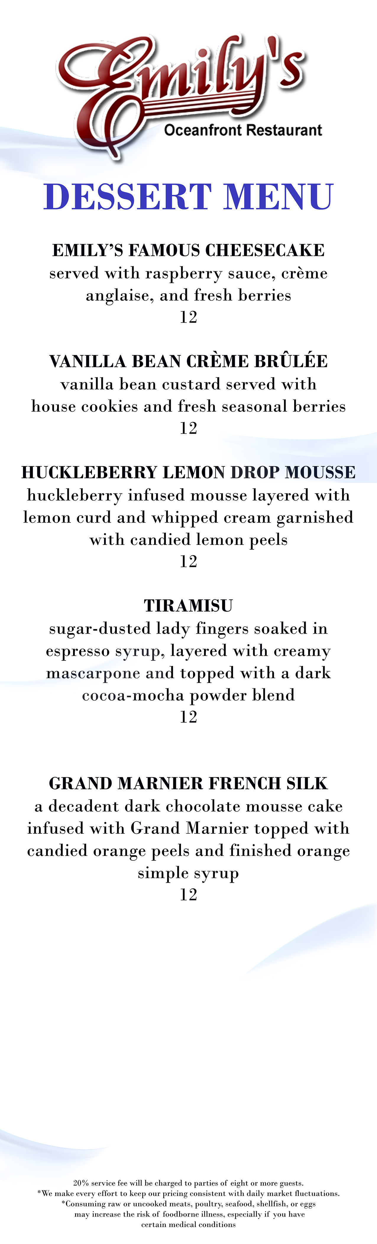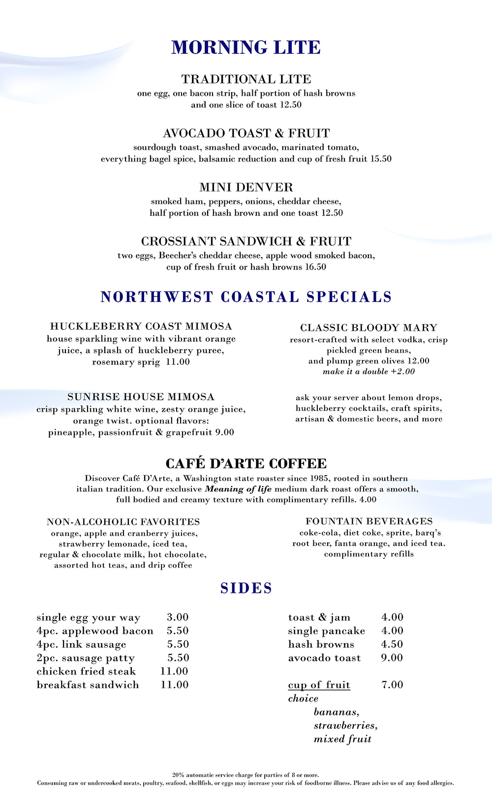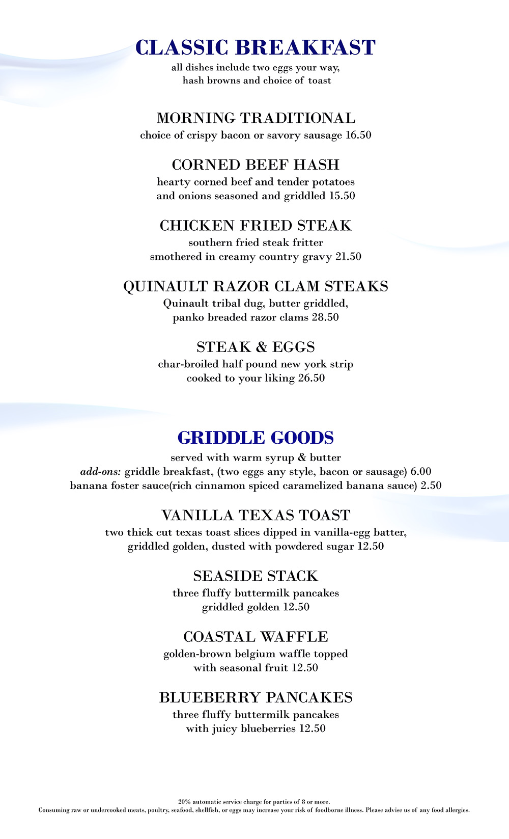 Classic Breakfast Morning Lite Eggpage Menu Emily's Brunch Lunch Coastal Greens Lunch Burgers & Classics Dinner Pasta Dinner Starters Dinner Farm To Flame Dessert